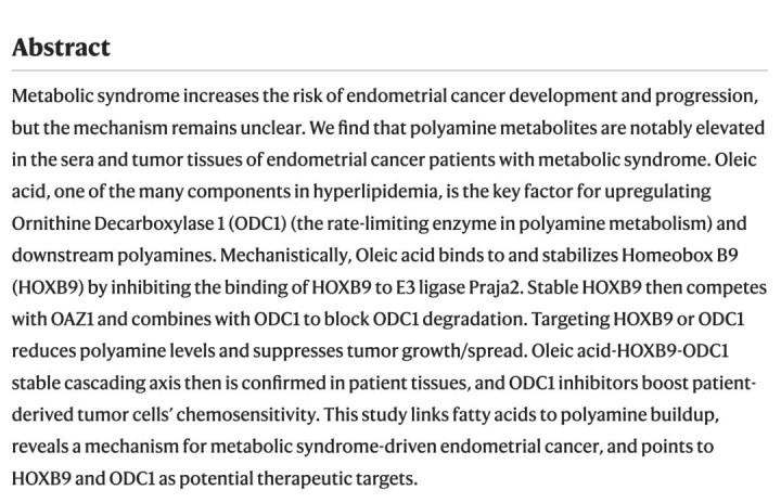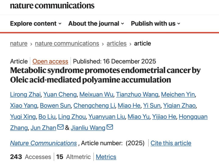 近日,北京大学人民医院王建六教授团队与北京大学战军研究员团队合作研究成果在国际权威期刊Nature子刊NatureCommunications在线发表。该研究首次揭示代谢综合征通过油酸(OA)-HOXB9-ODC1-多胺轴驱动子宫内膜癌进展的核心机制,为代谢相关子宫内膜癌的精准治疗提供了全新靶点和治疗策略。