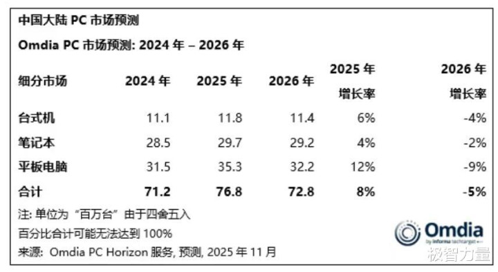 具体到各品类,该机构预测,台式机2026年会出现-4%的增长率,笔记本为-2%,平板电脑的降幅最为明显,将达到-9%。